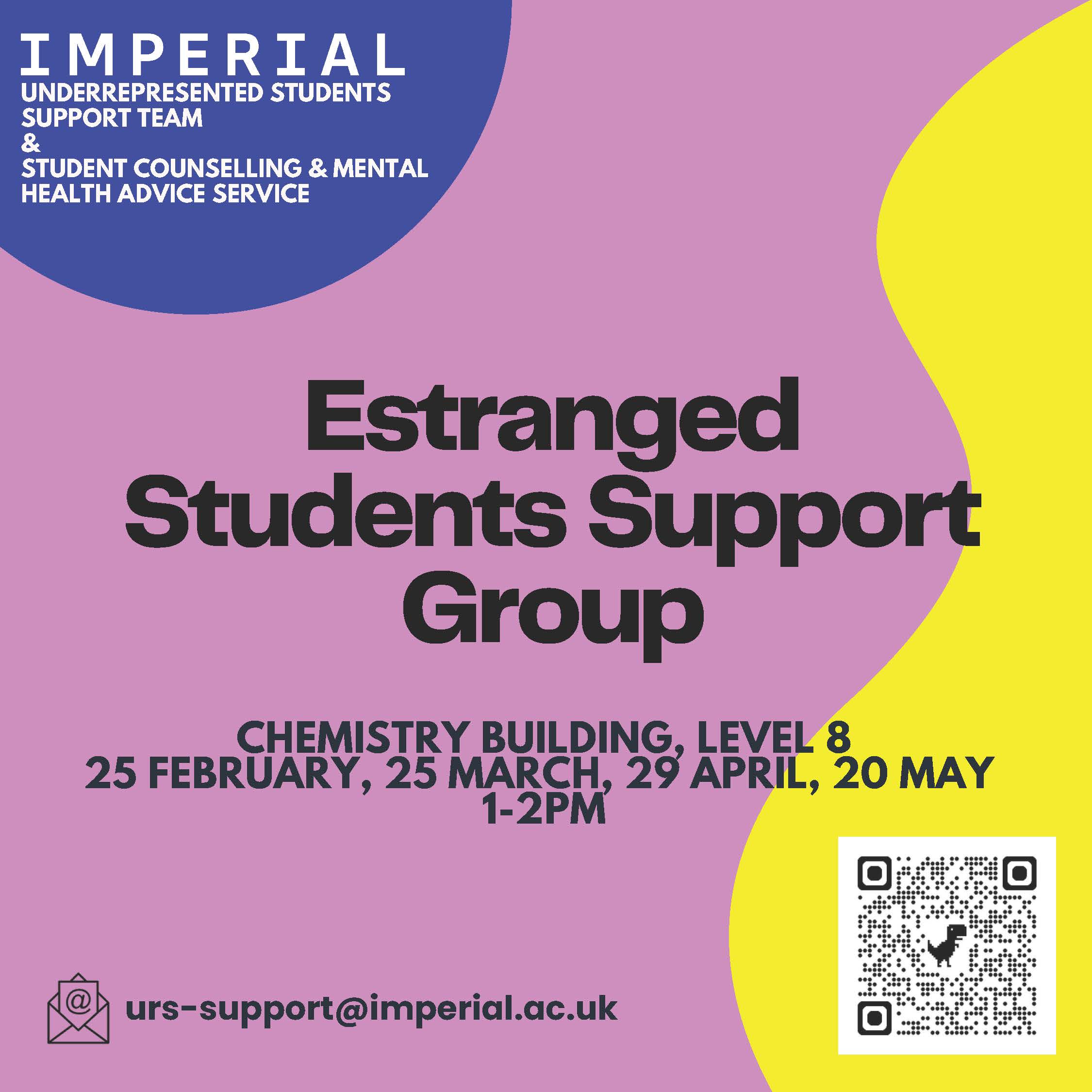The group is open to any Imperial student who has no or little contact with both parents. You do not need to be eligible for the support of the Imperial Underrepresented Student Support Team or meet the requirements for Estrangement according to the Student Loan Company to join this group.