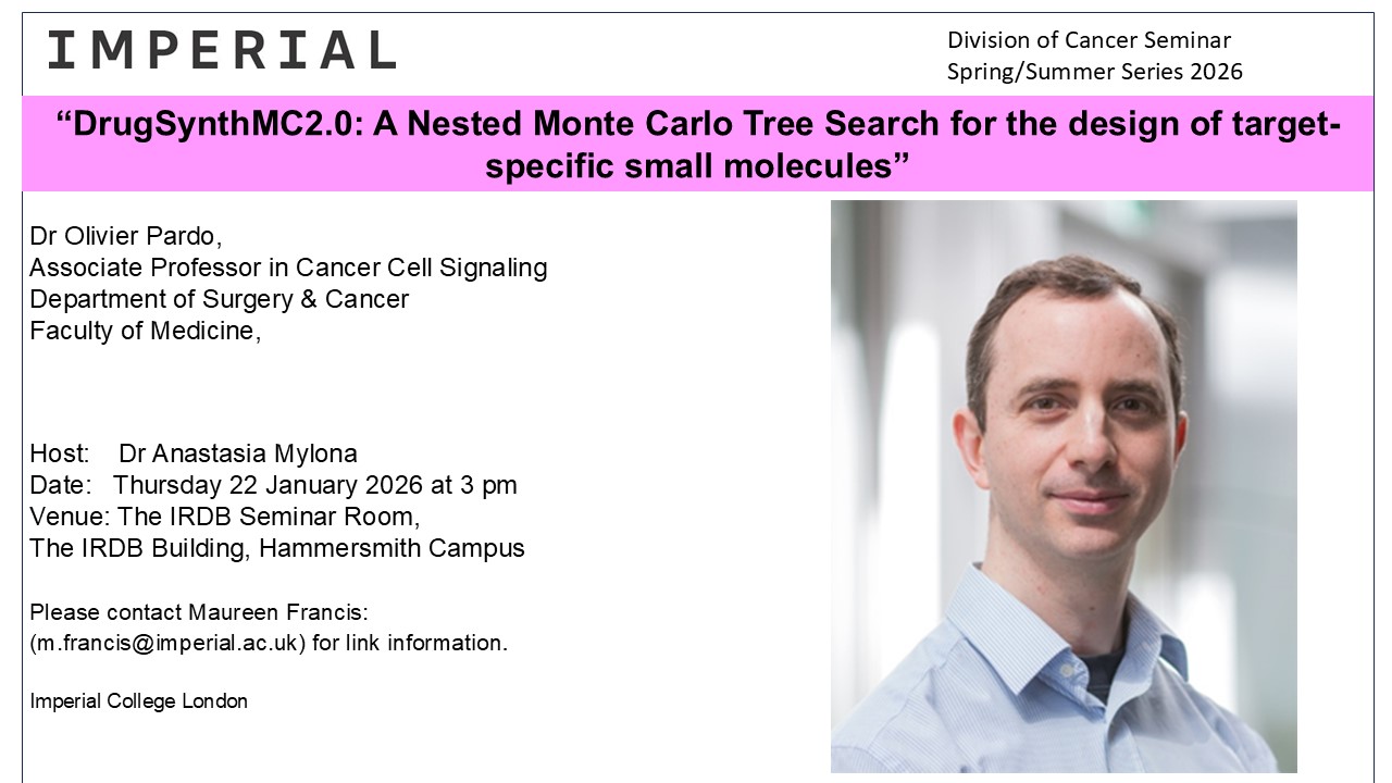 College Events Doctoral Students Research Staff Division of Cancer Seminar (22 Jan 2026) 9 January 2026 DrugSynthMC2.0: A Nested Monte Carlo Tree Search for the design of target-specific small molecules