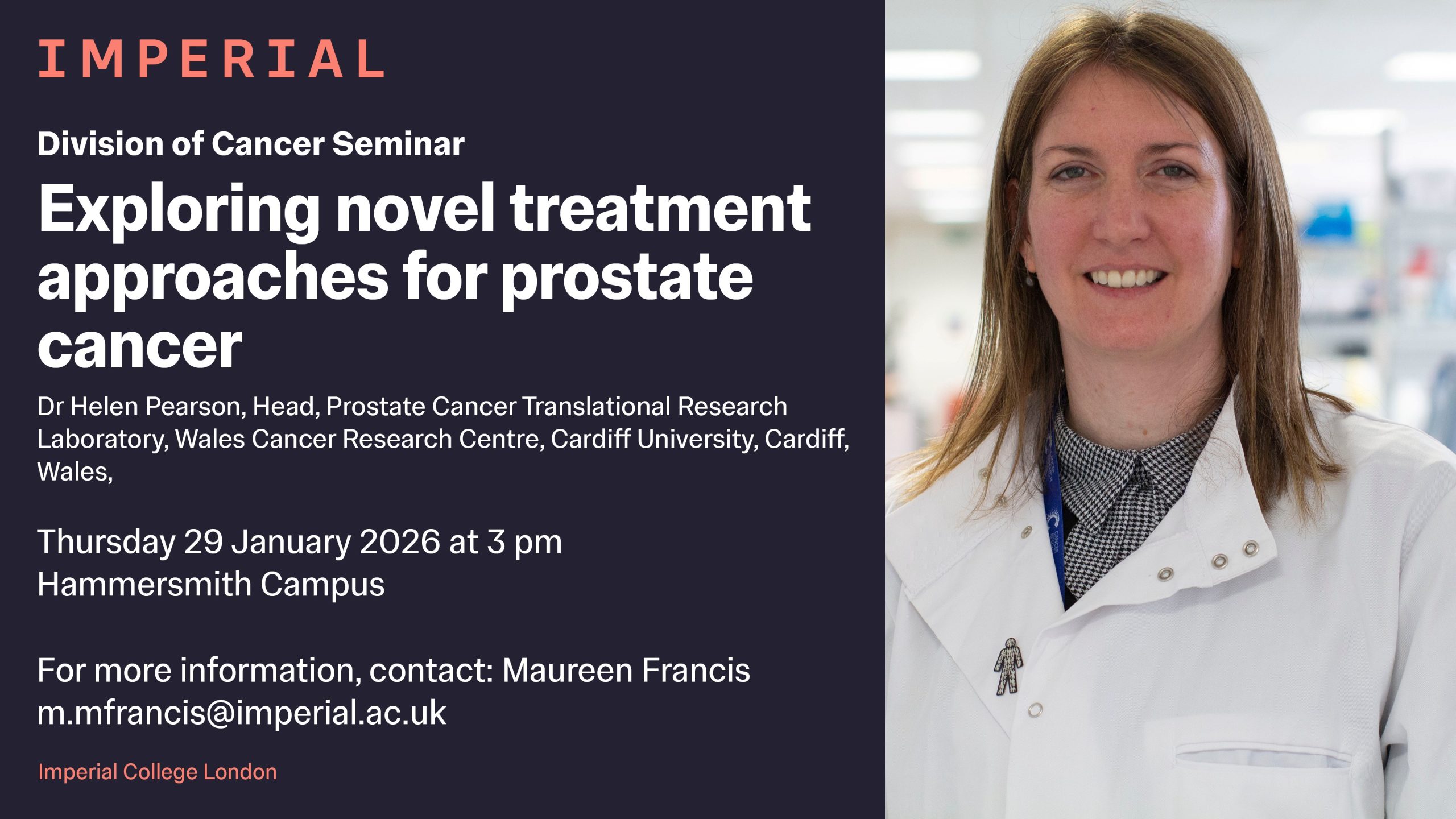 College Events Doctoral Students Research Staff Division of Cancer Seminar (29 Jan 2026) 21 January 2026 Exploring novel treatment approaches for prostate cancer